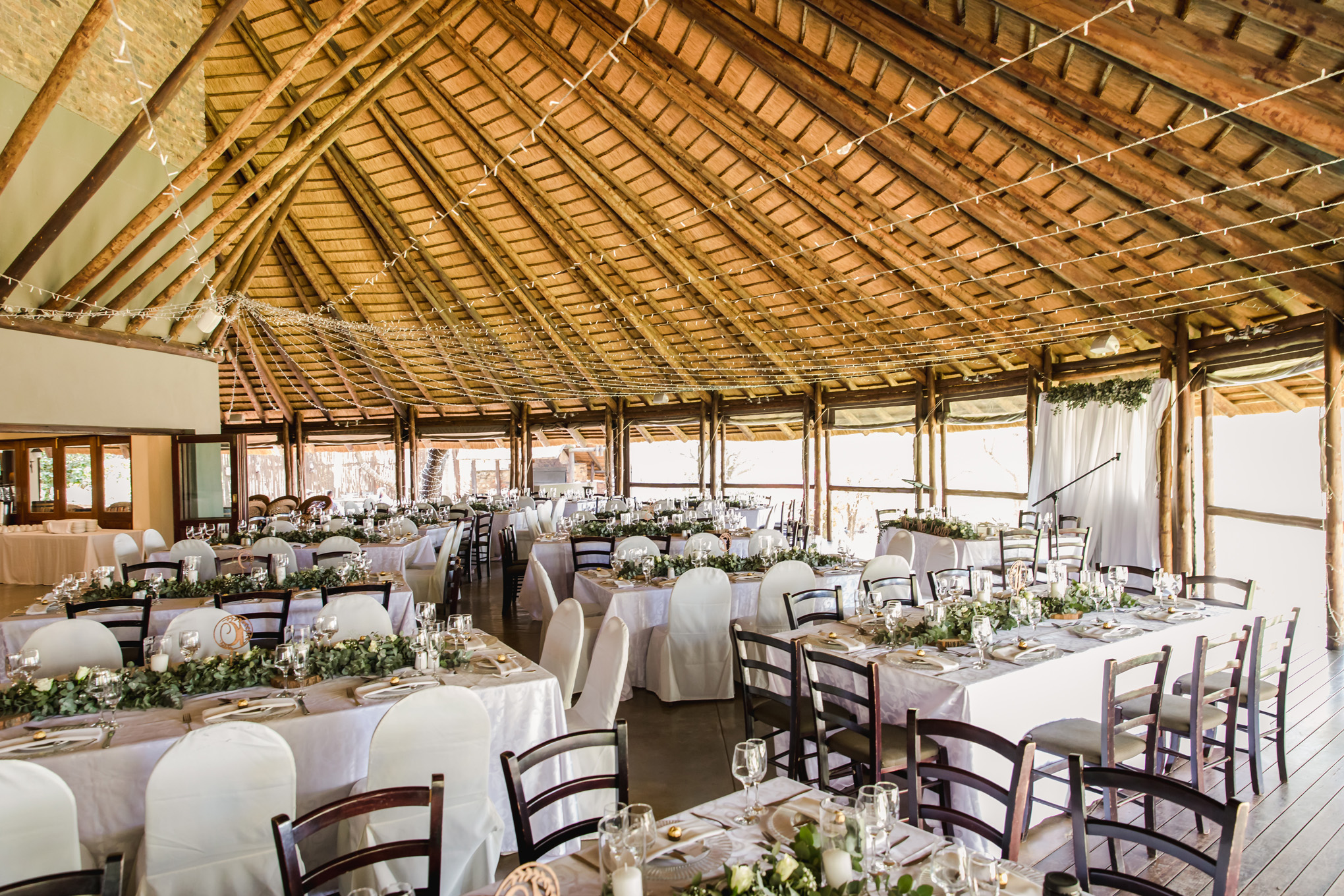 Leopard Lodge, a privately owned and well-established wedding venue with nearly 20 years of experience, invites you to exchange your vows in our open-air chapel, with the capacity to accommodate up to 200 guests. It offers an intimate yet grand setting for your unforgettable day. Conveniently situated within a short walking distance of the main lodge and reception area, this magical space blends natural beauty with effortless elegance.
